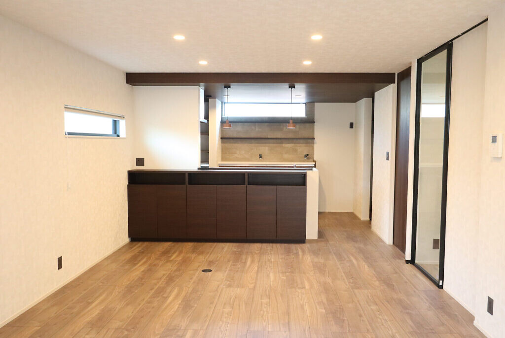 3. LDKのキッチンは木目の下がり天井で空間としてのデザイン性が高いです