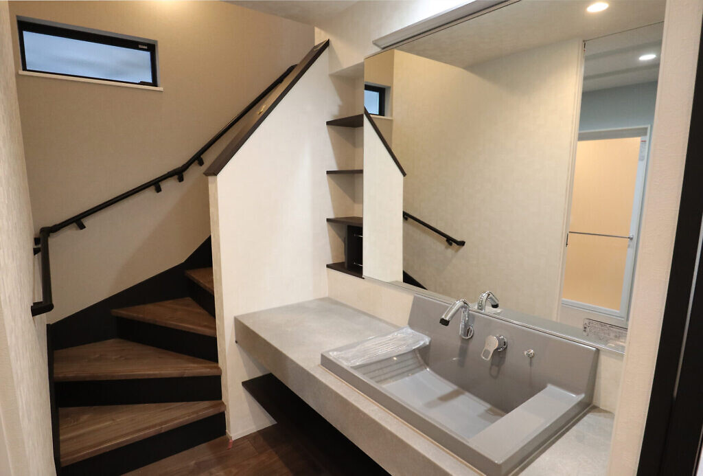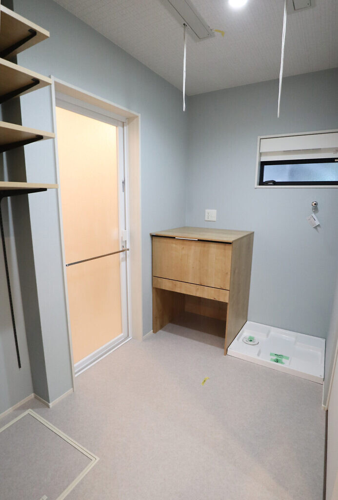 4. 1面鏡の大型鏡の洗面化粧台・ガス乾燥機「乾太くん」吊り下げ物干し等、効率的な設備機器も豊富に設置しました