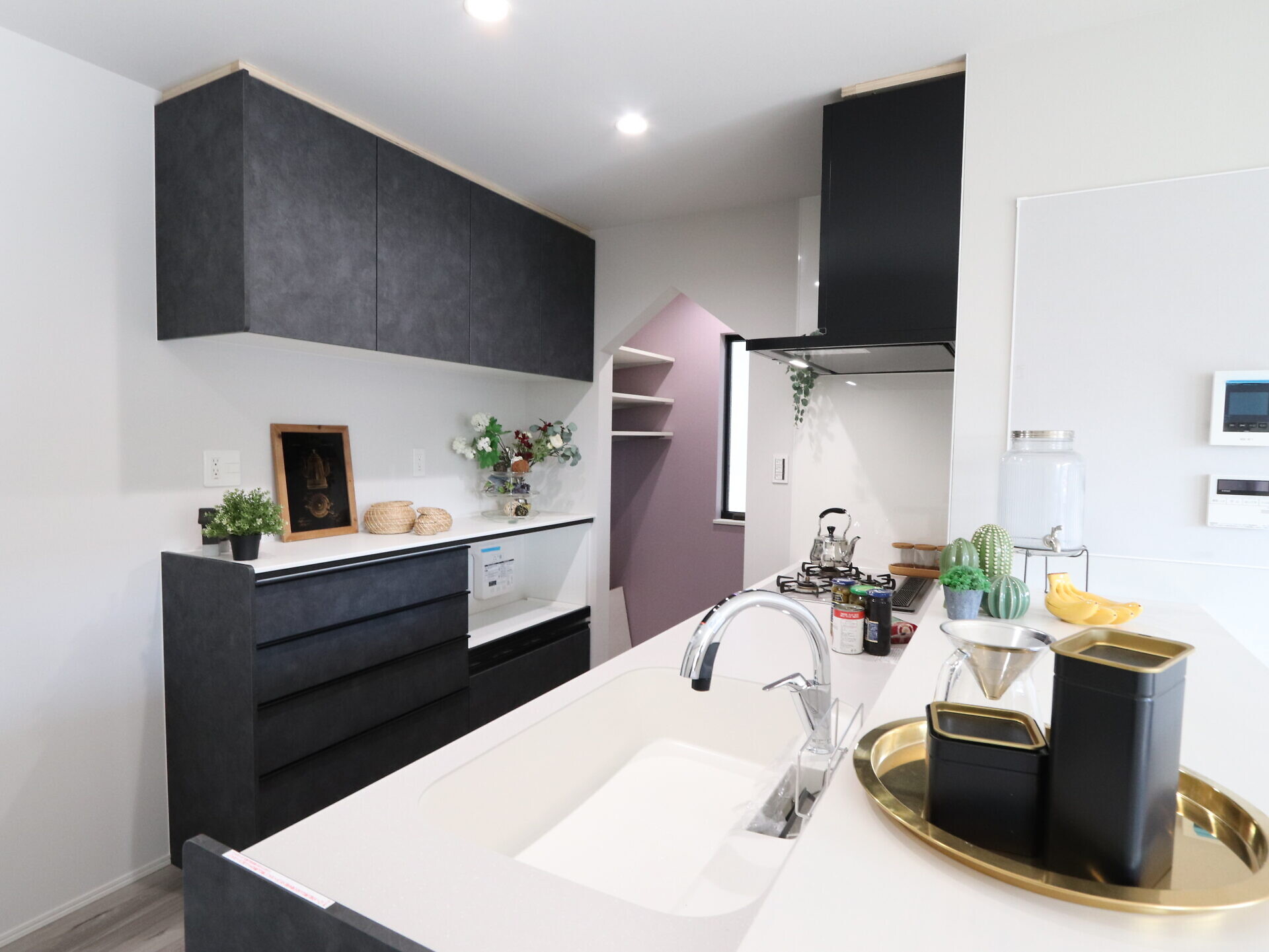 【キッチン】キッチンの奥にはパントリーを設置し食品ストックや備品がすっきりまとまります。カップボードも吊り戸棚を付けて2世帯分の収納もバッチリですね。