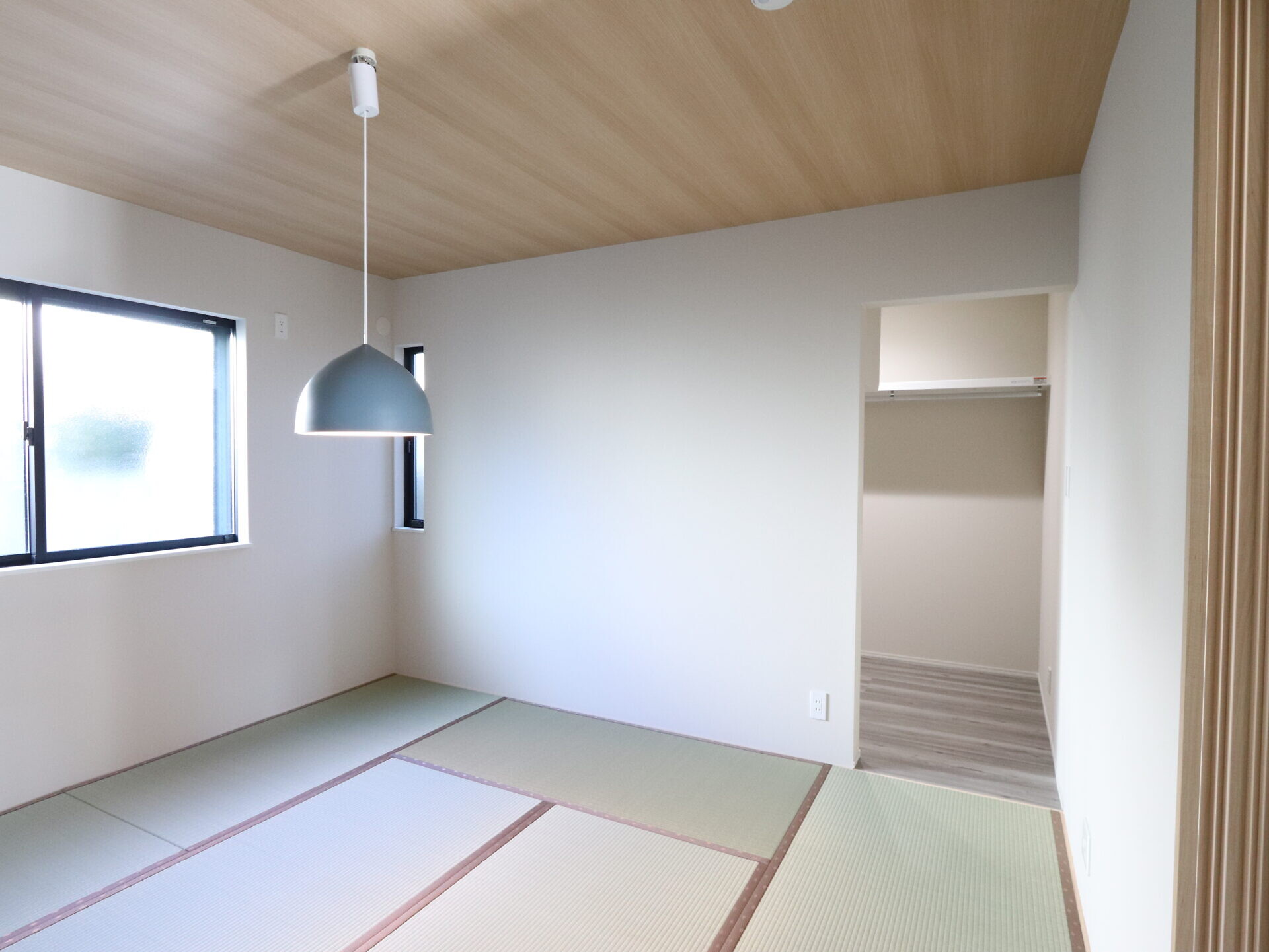 【和室②】1階和室はお施主ご両親様の主寝室。8畳の和室に加え奥には4畳のウォークインクローゼットがあります。敢えて建具を付けず圧迫感をなくしゆとりのある和室に仕上がりました。