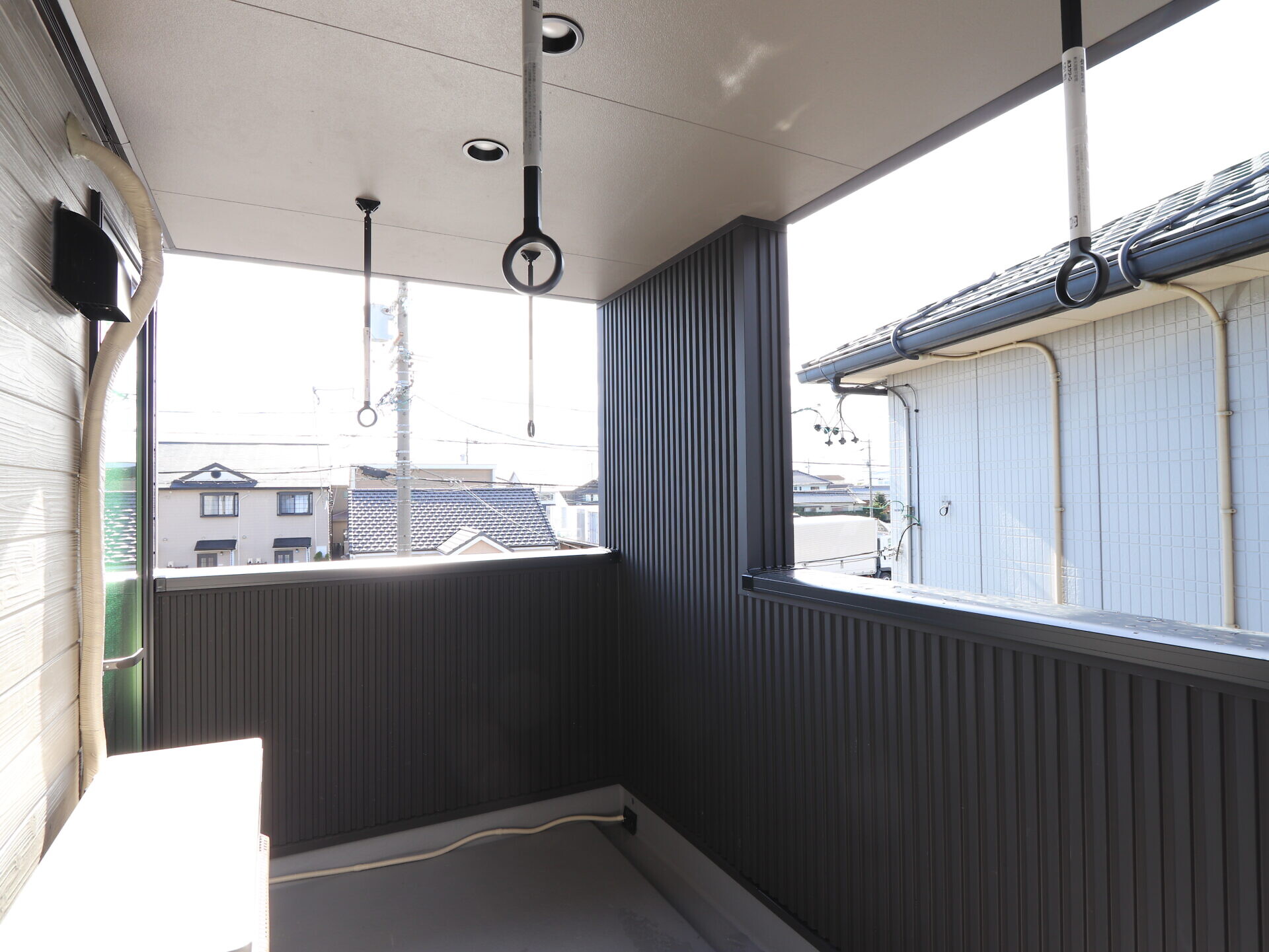 【バルコニー】物干し用に計画しましたインナーバルコニーは道路から見えにくく洗濯物も気にせず干せます。風の通りも良くテーブルを置いてテラスカフェのようにも出来ますね。
