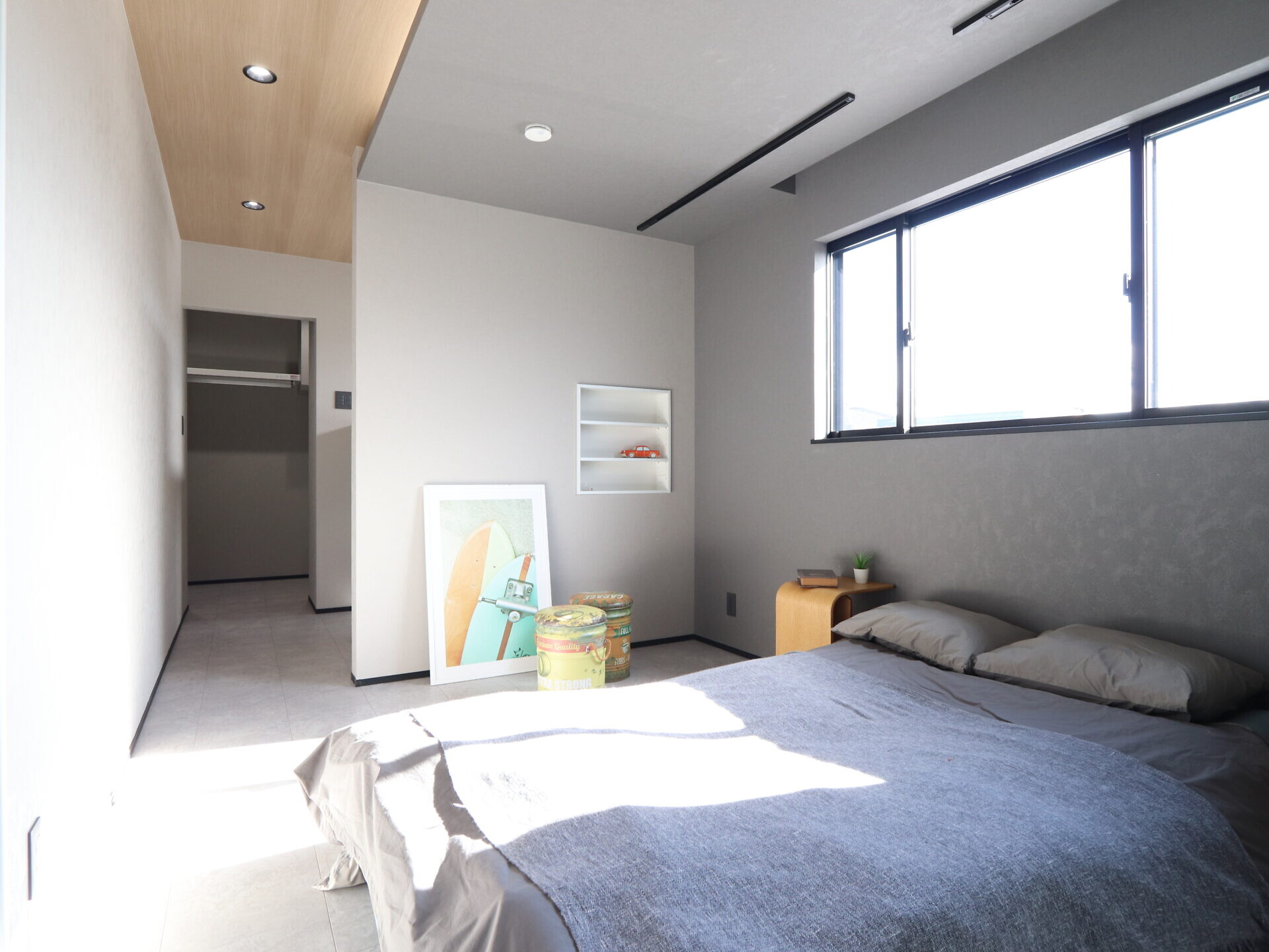 【主寝室】お施主様用2階主寝室。電動のカーテンレールを設置予定で朝は自動でカーテンが開き朝日で目覚める仕様に。天井に間接照明も付けて雰囲気の良い寝室です。
