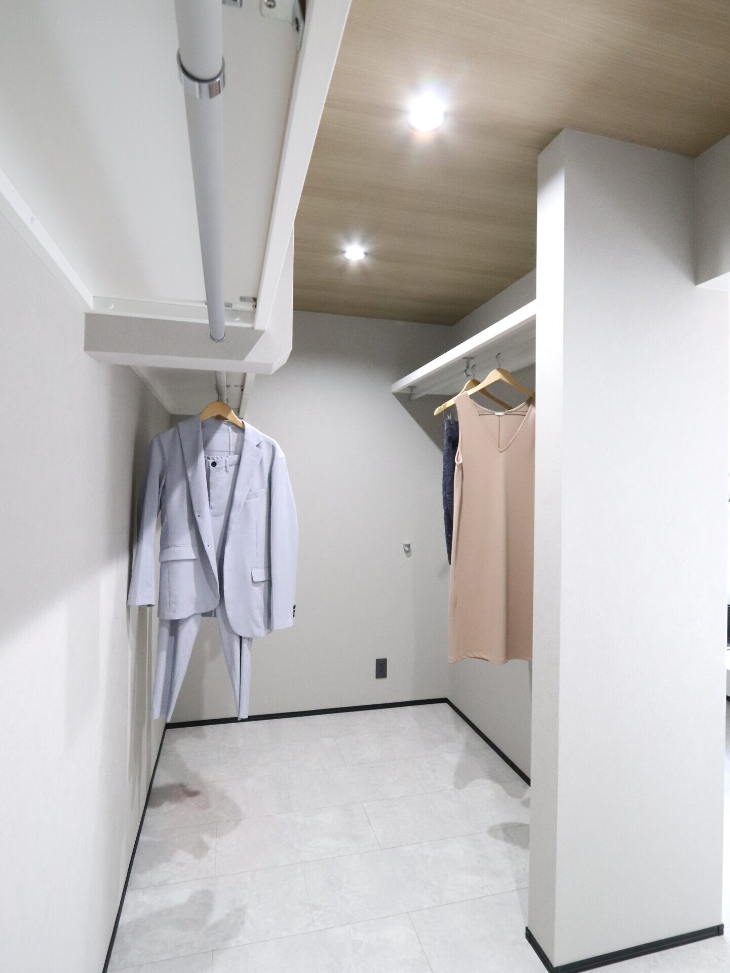 約4.5帖のウォークインクローゼットでご夫婦共有の収納部屋。コートやワンピースなども余裕を持ってかけられてチェストを置けば収納力抜群。