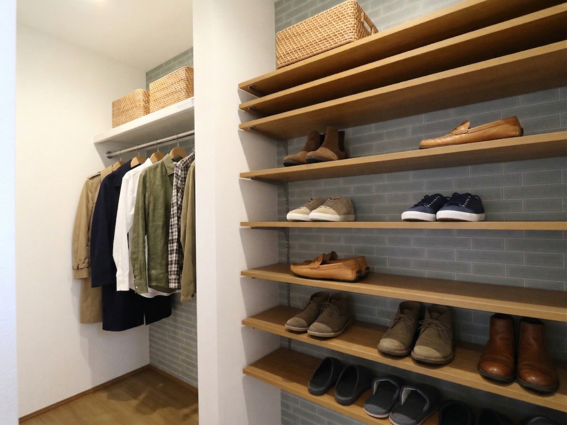【玄関室内】玄関ホールにオープンタイプの収納を設け上着を玄関で脱ぐことが出来ます。下駄箱の代わりを可動棚にすることで背の高い靴や土間部分を空けて物置に出来たりもします。