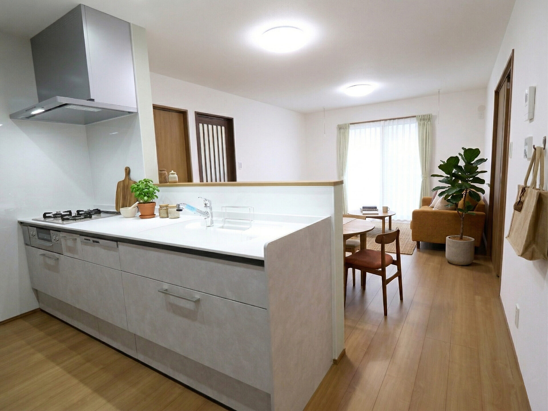 【キッチン】家事をしながらリビングを見渡せる対面キッチンを採用。日当たりも良くリビングがより広く感じます。