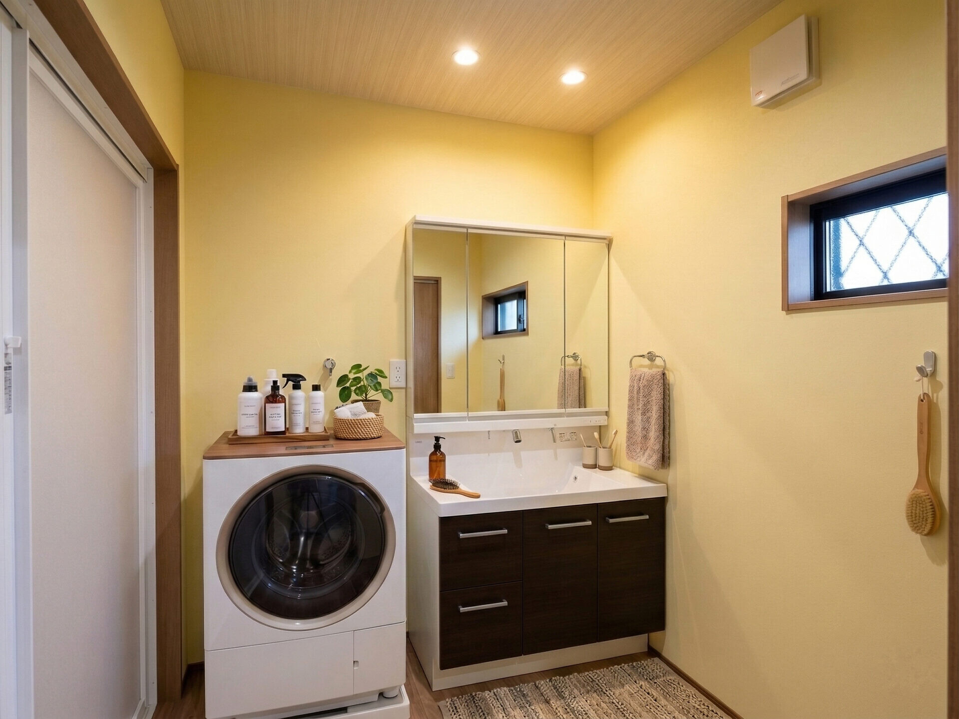 【脱衣室】幅広い化粧台でボウル周りにも物が置ける仕様です。床は木目のクッションフロアにして廊下とも一体感のある仕上がりになりました。