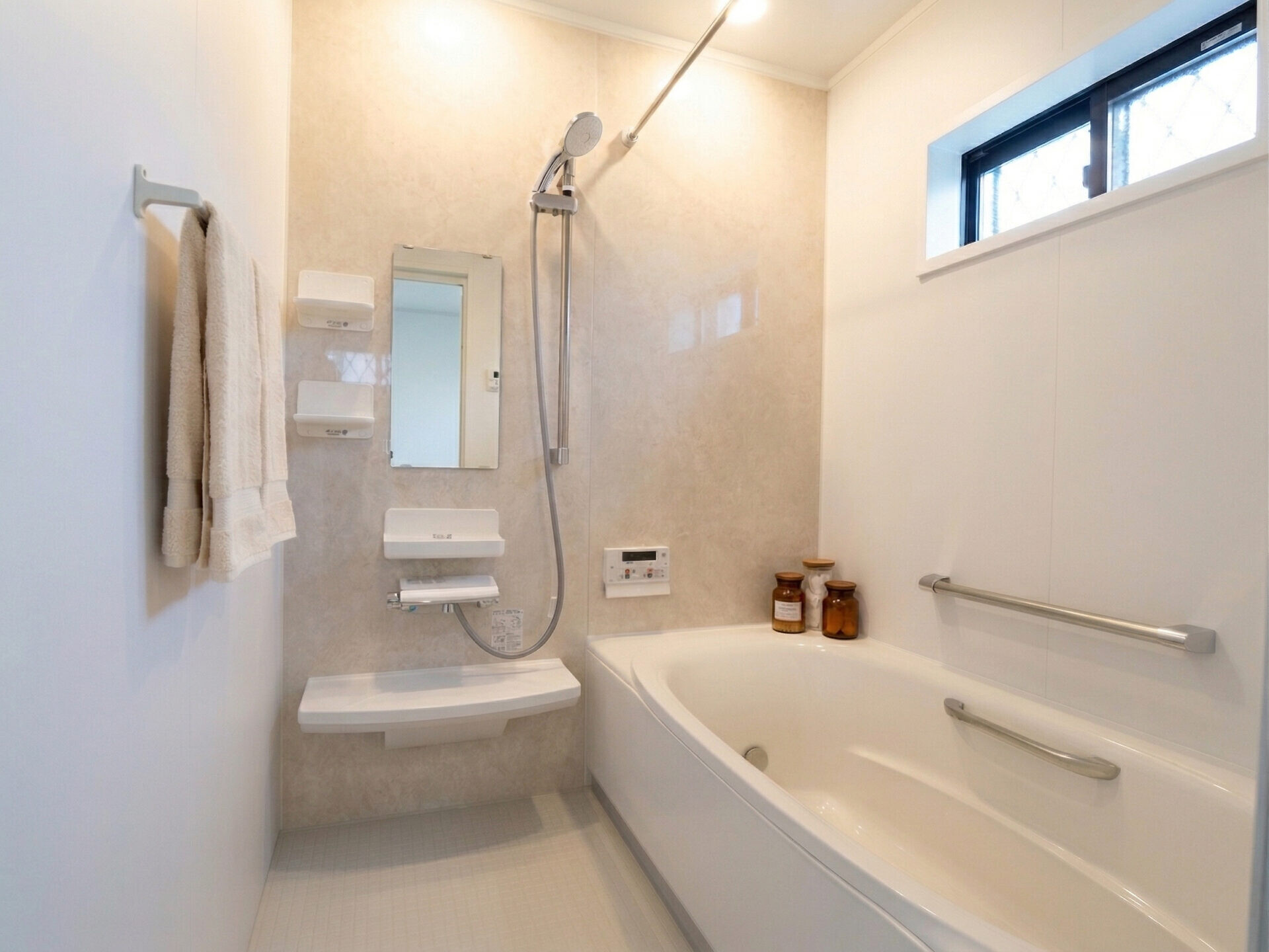 【浴室】浴暖付きの浴室で冬は暖房、夏は涼風、ランドリーパイプも付いているので雨の日に洗濯物も乾かせますね。浴槽内の手摺りは立ち上がるときに必須。浴槽上部の手摺りは浴槽の出入りのサポートになります。