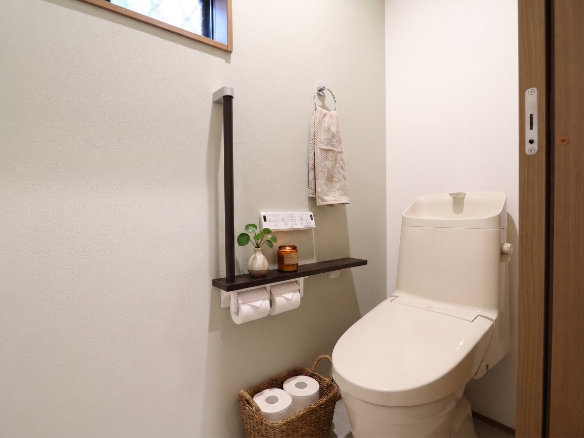 【トイレ】棚手摺り付きで座るのも立ち上がるのもサポートしてくれます。
